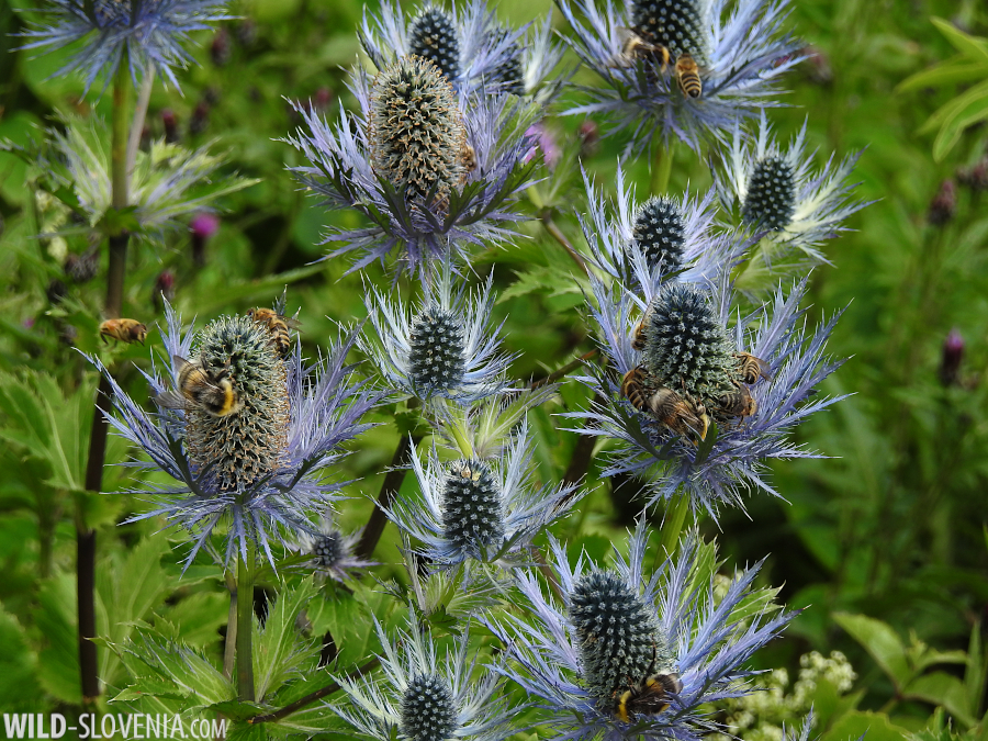 Alpine EryngoEryngium alpinum, also known as Queen of the Alps. An extremely rare species in Slovenia, growing virtually only on Mts. Porezen and Črna prst. It is found on the steepest slopes, where the human hand didn't manage to reach. In the past it was heavily collected and sold at markets, hence it disappeared from all but a few of its former localities. It was already rare at the beginning of the 20th century.